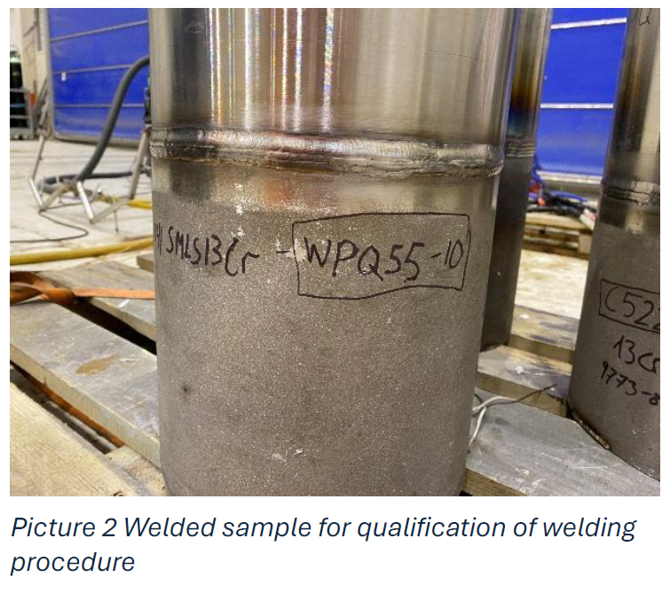Parallelt har Westcon kvalifisert sveiseprosedyrer for dette krevende materialet. Testprøver ble sendt til Elements materiallaboratorium i Italia for sour service‑testing. Prøvene ble utsatt for lav pH og belastning for å verifisere motstand mot stresskorrosjonsriss (SCC) og sulfidsprøhet (SSC).